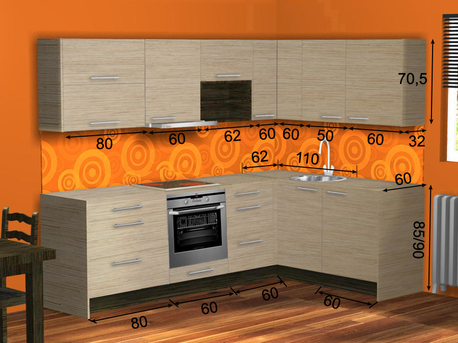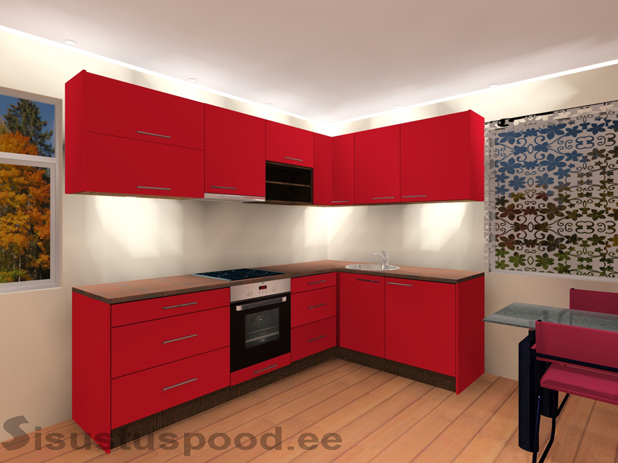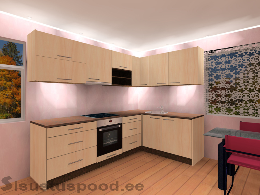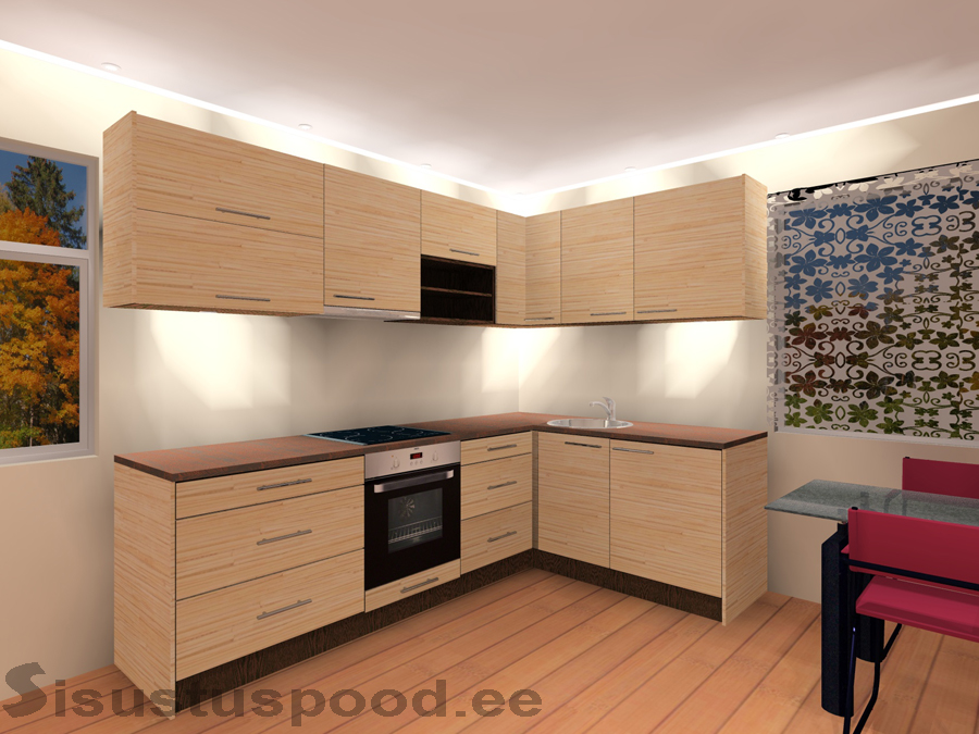 - Nurgakapil ja kõrval oleval 1 uksega 60 cm kapil on ühtne tööpind (170 cm), valamu ava ei ole sisse lõigatud. Nurgakapist vasakul olevatel 80 cm sahtlitega kapil, 60 cm pliidikapil, 60 cm sahtlitega kapil on ühtne tööpind (200 cm), pliidi ava ei ole sisse lõigatud