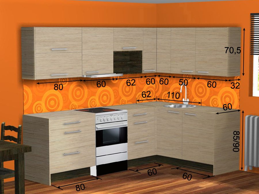 - Nurgakapil ja kõrval oleval 1 uksega 60 cm kapil on ühtne tööpind (170 cm), valamu ava ei ole sisse lõigatud