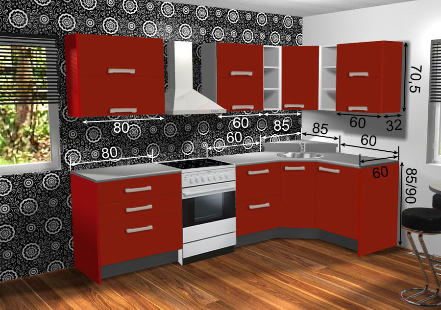 - Ülemise nurgakapi ukse taga on 1 riiul, alumine nurgakapp valamu jaoks on ilma riiuli ja tagaseinata, alumisel 60 cm kapil on 1 riiul
