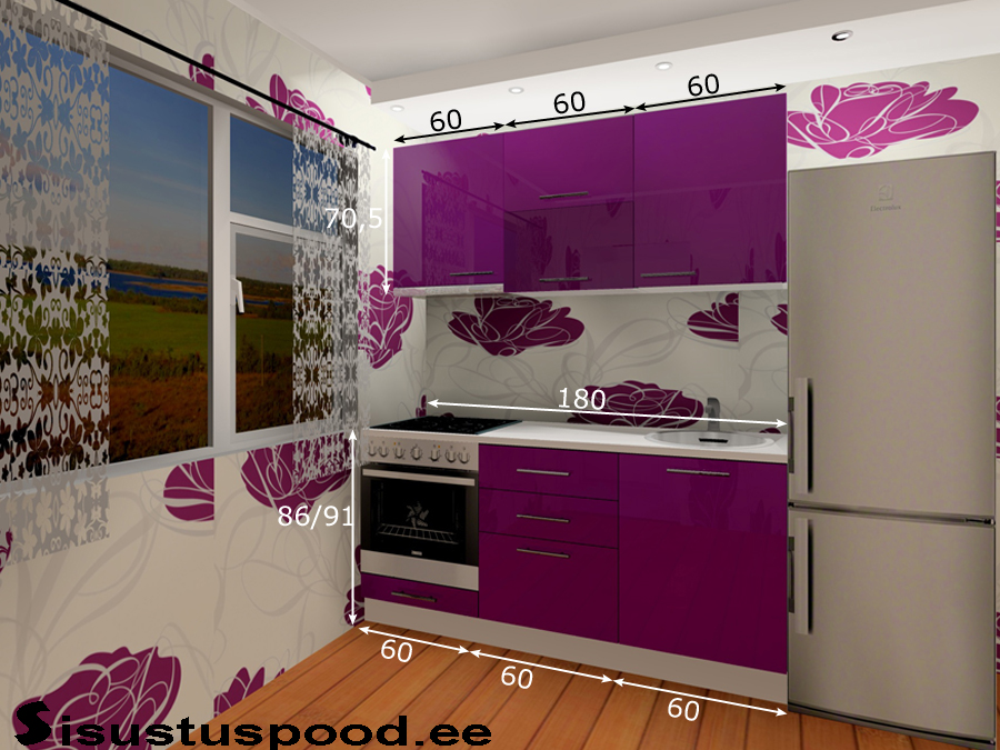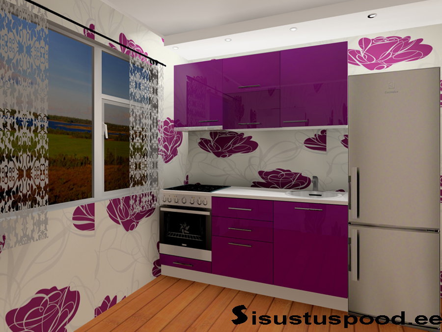Viimistlused pildil: korpus valge, uksed lilla, tööpind valge, sokkel valge