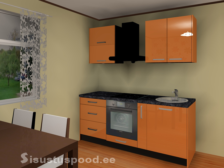 Viimistlused pildil: korpus grafiitmust, uksed oranž, tööpind wmust marmor, sokkel grafiitmust, käepidemed Riva