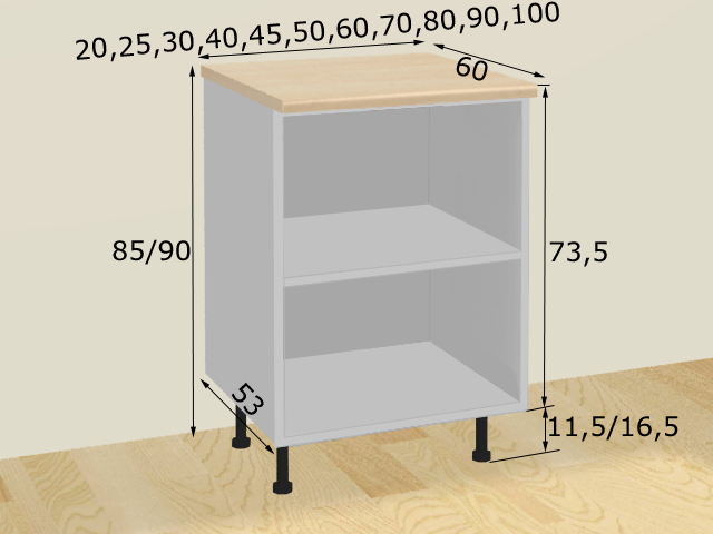 Laius: 20, 25, 30, 40, 45, 50, 60, 70, 80, 90, 100 cm Kõrgus: 85/90 cm