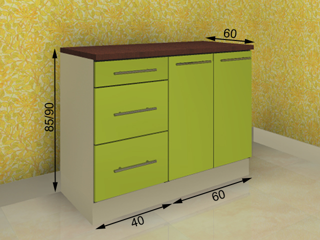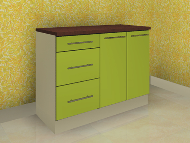 Korpus valge, tööpinna värvi on võimalik valida viimistluste alt (tume pähkel), uste värvi võimalik valida viimistluste alt (pildil roheline). Toode saabub detailidena, vajab kokkupanemist.