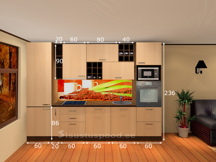 Kõrge kapi alumises osas 1 riiul ja ülemises osas 3 riiulit. Kapi saab kohandada ka integreeritava külmiku jaoks. Tellimisel täpsustada külmiku mudel